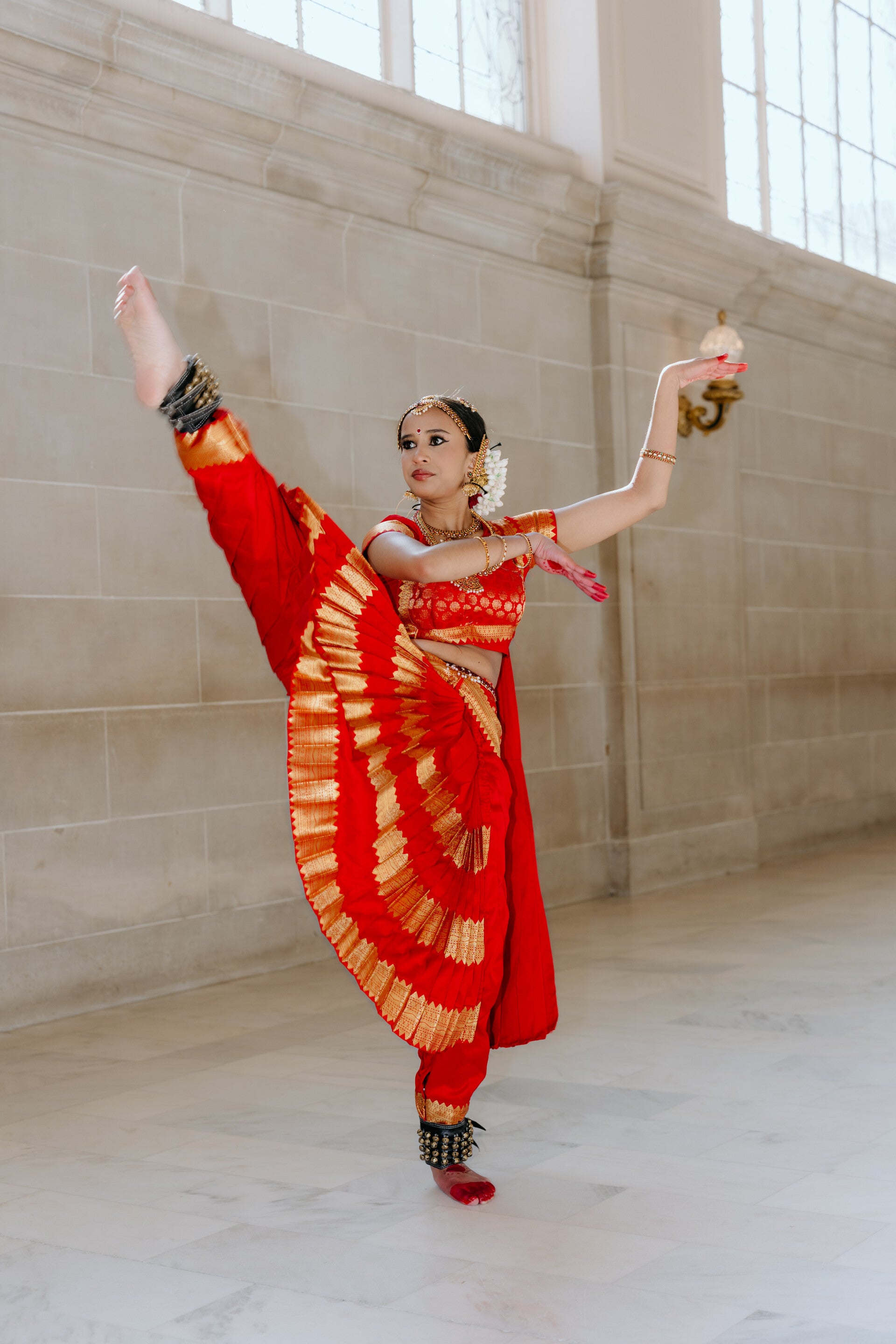 Her Salangai (Chalangai) Pooja was performed under the guidance of Mrs. Radhika Dinesh, during which she received her first pair of salangai at the temple in Mountain House, California — a sacred milestone marking her formal initiation into stage performance.